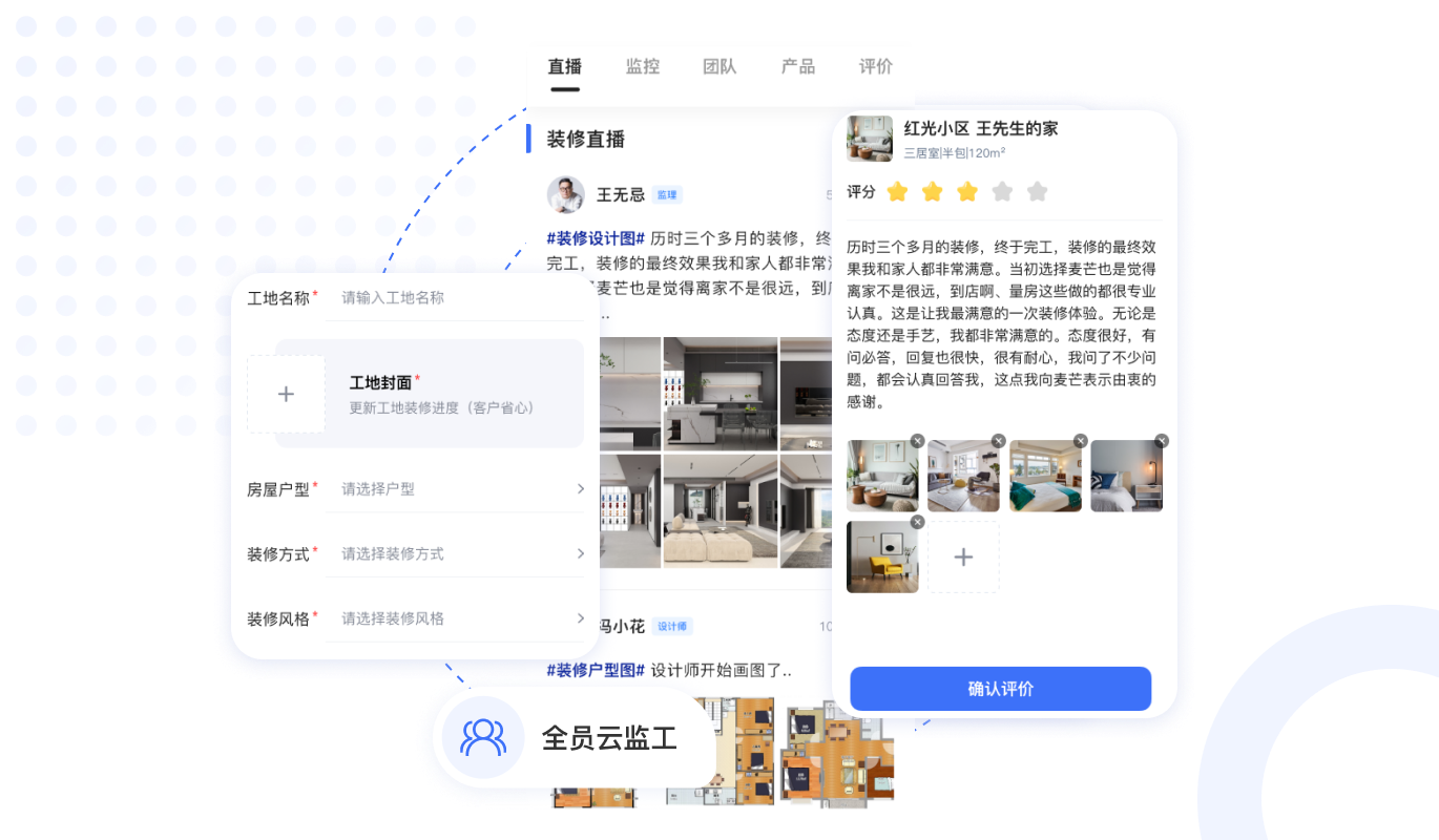 工地實時監控直播,業主足不出戶,實時觀看裝修現場,工地圖文,視頻,VR全景實時更新,保證裝修進度。